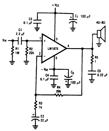 LM1875是一高质量的音响放大器,它可以为4欧姆的负载提供25W的输出功率。当使用单电源供电时,它能向4欧姆的负载提供20W的功率。并且只产生0.015%的失真。