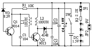 以把单节1.5V电压电池升高到9左右的电压后,驱动4个LED发光或供给其他需要高电压低电流的地方使用,例如代替万用表的9V积层电池.