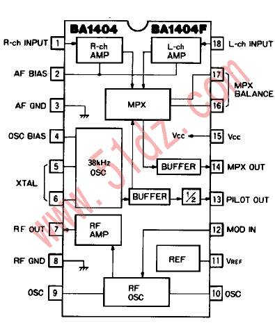 BA1404的引脚功能如图表1所示,图1为BA1404结构功能框图。它主要由前置音频放大器(AMP),立体声调制器(MPX),FM调制器及射频放大器组成。 立体声前置级分别为两个声道的音频放大器。输入为0.5mV时,增益高达37dB,频带宽度为19kHz。如输入信号中存在频率高于19kHz的成分,则必须在输入端加一个低通滤波器,否则两个声道的分离度会下降。 在立体声调制组,振荡器输出的38kHz信号于立体声调制。通常在16、17脚接一可调电阻,以获得最佳的通道分离度。 立体声混合信号(MPX输出信号)与导频输出信号(PILOT OUT)合成后的调制信号通过12脚进入射频振荡器并对载波进行FM调制,经射频放大后输出射频信号,射频信号的典型值在600mV左右。 BA1404内部还提供了一个参考电压单元VREF。设计者可以利用这个电压信号改变外接变容二极管的电容值,继而改变载波的振荡频率。因此,只要控制一个电阻的分压值就可以达到改变发射频率的目的,这是比较独特的设计。