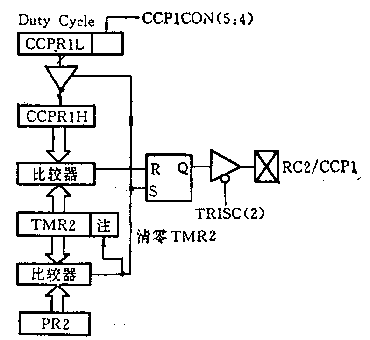 此时RC2/CCP1脚应置为输出态,在PWM模式下,用户 将8位频宽比(Duty Cycle)置人CCPR1的低8位字节CCPR1L,而高8位CCPR1H作为PWM寄存器。PWM产生的过